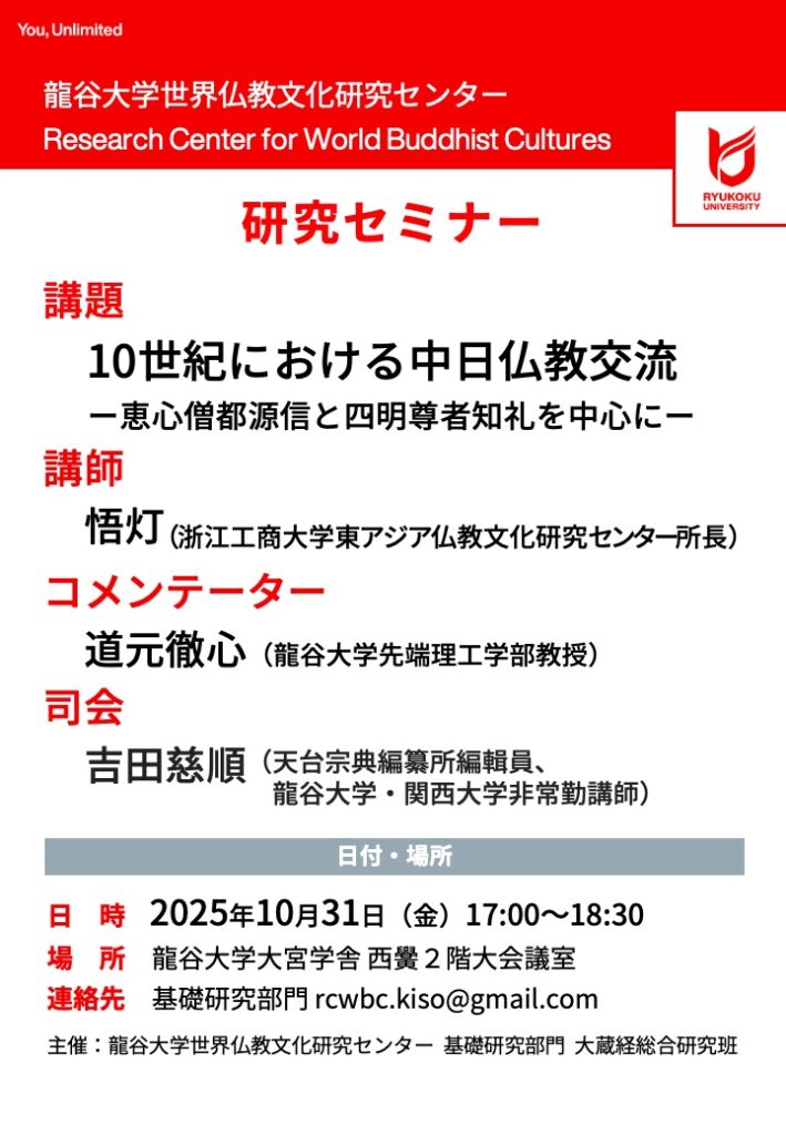 下記の通り、2025年10月31日(金)17:00〜18:30、「10世紀における中日仏教交流 ー恵心僧都源信と四明尊者知礼を中心にー」と題する講演会(対面のみ)を開催いたします。ご関心のある方は、ぜひお越しください。