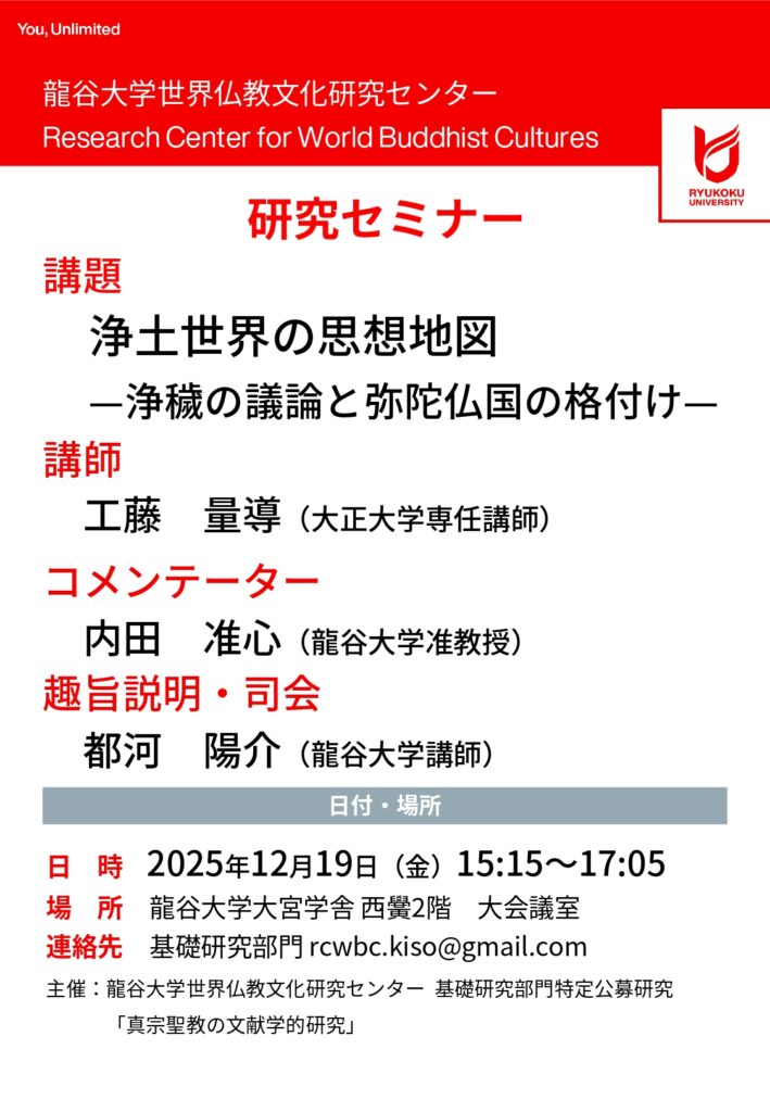 【ご案内】2025年12月19日(金)15:15〜17:05、「浄⼟世界の思想地図—浄穢の議論と弥陀仏国の格付け—」と題する研究セミナーを開催いたします。ご関心のある方は、ぜひお越しください。
