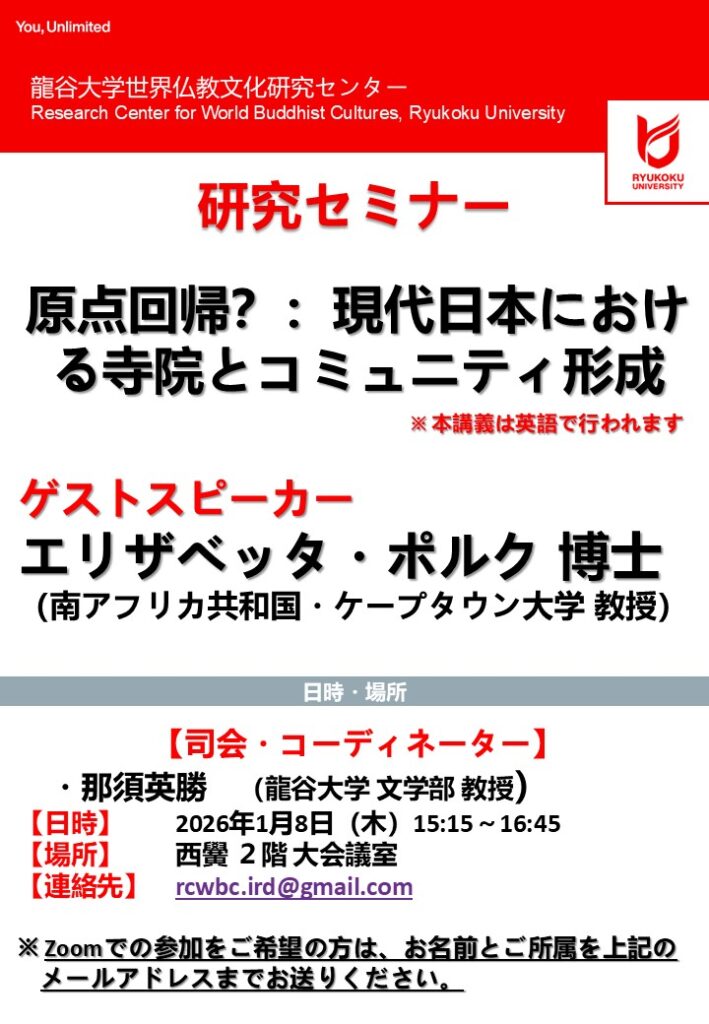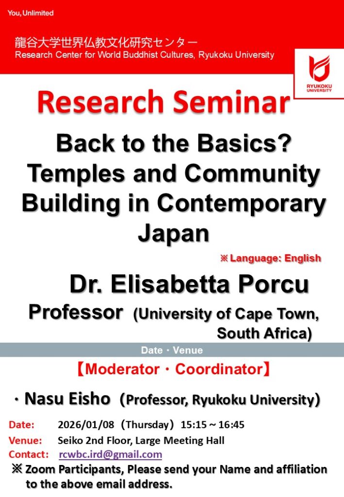 下記の通り、龍谷大学世界仏教文化研究センター国際研究部門主催の公開研究セミナーをハイフレックス形式で開催いたします。ご関心の方は、奮ってご参加ください。