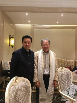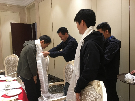 本会議前日の10月24日(金)には、日本側参加者のための歓迎会が開かれ、中国蔵学研究センター総幹事(=センター長)鄭堆(ダムドゥル)氏が敬意・祝意を表す哈達(カタ)を日本側参加者全員に贈った。